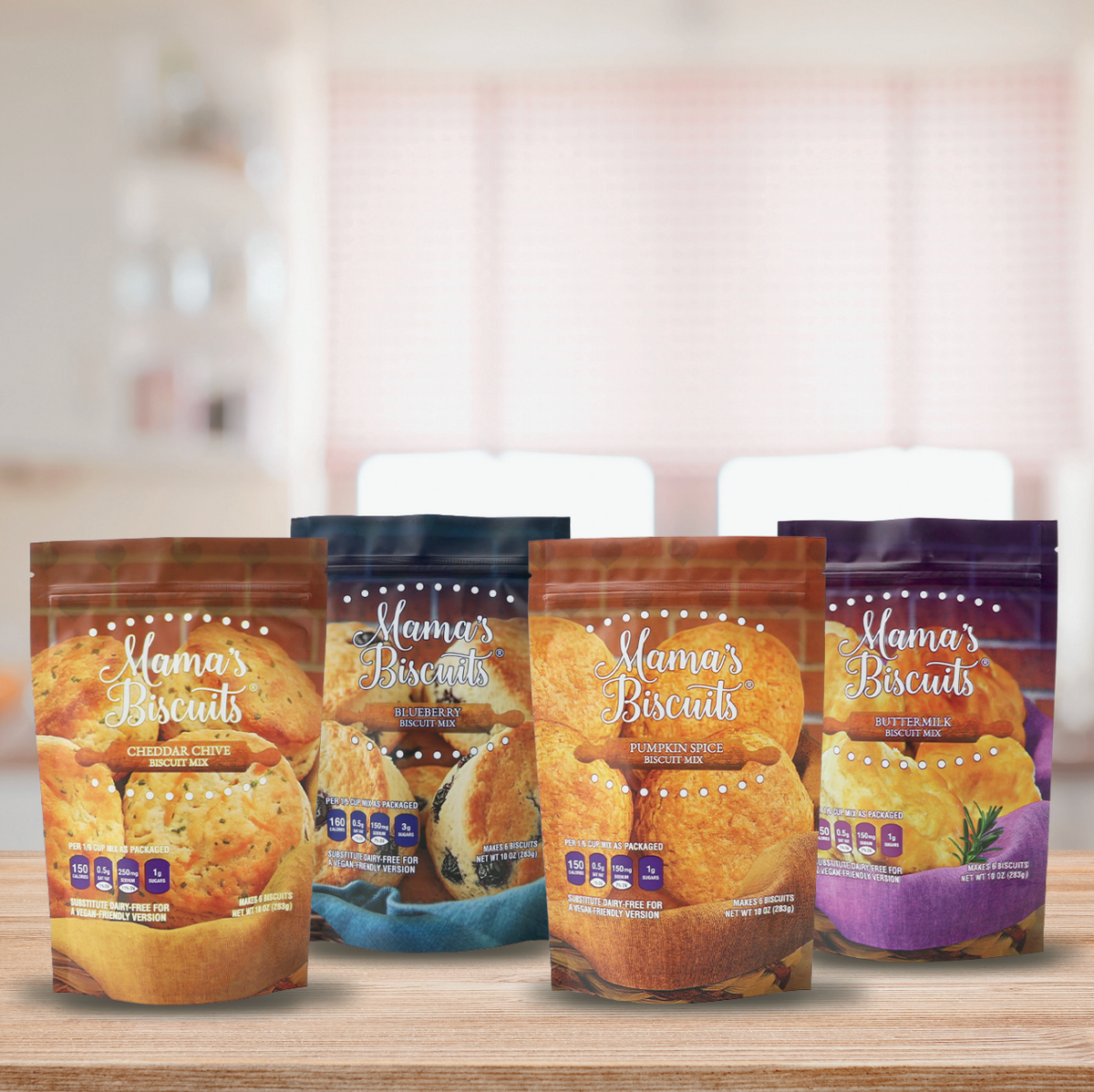 Mama’s Biscuits variety pack offers a delightful selection of flavors in both sweet & savory.  This bundle includes southern style Buttermilk, sweet and tart Blueberry, your favorite restaurant dupe Cheddar Chive, and warm notes of Pumpkin Spice, all perfect for any occasion. Each mix promises to deliver a homemade taste with the convenience of quick preparation, making it easy as 1-2-3 to enjoy fresh, warm biscuits anytime.